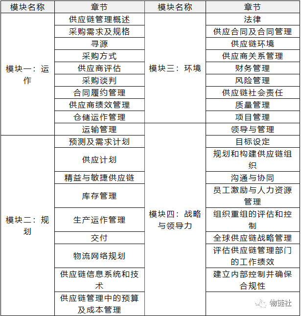 SCMP供应链管理专家认证培训课程包含四大模块,分别为《供应链管理运作》、《供应链管理规划》、《供应链管理环境》、《供应链管理战略与领导力》,具体内容如下:
